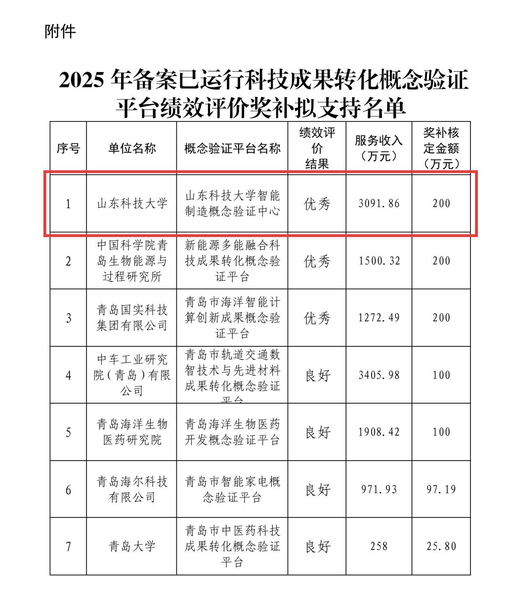 点击:近日,青岛市科学技术局公布了2025年科技成果转化概念验证平台绩效评价奖补资金拟支持单位名单,山东科技大学智能制造概念验证中心获评优秀,位列青岛市26家概念验证平台第一名,获得奖补200万元。